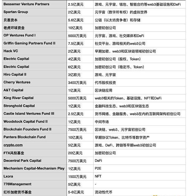 金色财经整理发现,进入2022年后,风投机构推出的各类加密货币基金已过百亿美元。其中不乏知名投资机构的身影,包括红杉资本、贝恩资本等。