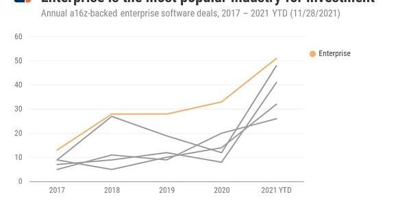图|2017年至2021年a16z在企业科技领域的投资数量变化