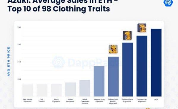 从98件服装属性来看,四件金色服装直接影响NFT的价格。这些金色的Kigurumis是最稀有的属性类型之一,猫(0.05%)是最稀有的。没有衣服的Azukis(0.05%)也是这个系列中最昂贵的作品之一,平均价格为78.66ETH($208,000)。