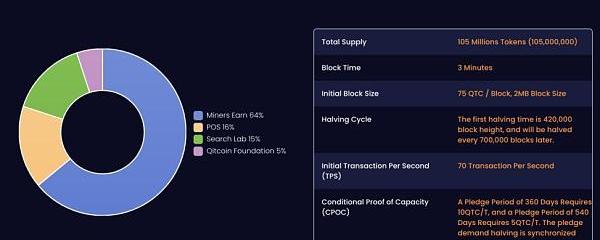 QitChain的Token是QTC,发行总量为1.05亿。其发行分为两类,第一类是初始发行;第二类是网络启动以后随着区块产生而发行,为通缩发行。初始发行量为2100万QTC,占通证总量的20%,其中包括基金会5%,搜索实验室15%。区块产生总量为8400万QTC,占总通证的80%。区块产生规则如下:初始区块:平均3分钟一个区块;每个区块产生75QTC;首次减半时间约为42万区块高度,之后每新增70万区块高度减半一次。