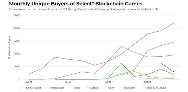 Sorare追踪现实世界的足球统计数据,奖励那些拥有表现出色的运动员的NFT卡牌玩家。游戏的性质很自然的吸引了广大的足球爱好者。如上所述,在2021年下半年,SorareNFT的首次购买者数量出现了激增。2021年12月,SorareNFT的每月独立买家总数首次超过20000人。我们需要特别注意的是,与AxieInfinity不同,Sorare的玩家不需要购买NFT就可以开始游戏。这很可能意味着Sorare的游戏玩家总数超过了那些进行二次NFT购买的玩家数。