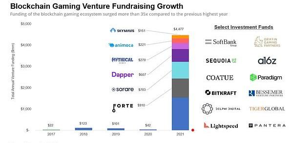 2021年的风险投资与前几年形成了鲜明的对比,多家企业的融资额度超过了以往所有年份的总和。例子包括Forte,一个与众多游戏工作室合作的端到端区块链游戏开发平台。也许这个数据值得注意的是这个名单中产品和服务的多样性。工作室和基础设施/工具都有相对应的代表,更不用说游戏栈的其他组成部分,包括了NFT市场和各种第一层或第二层区块链。