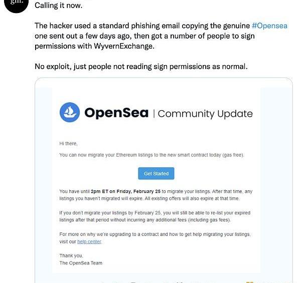 随后,gmDAO创始人Cyphr.ETH发推称?,黑客使用了标准网络钓鱼电子邮件复制了几天前发生的“正版OpenSea”电子邮件,然后让一些用户使用WyvernExchange签署权限。OpenSea未出现漏洞,只是人们没有像往常一样阅读签名权限。