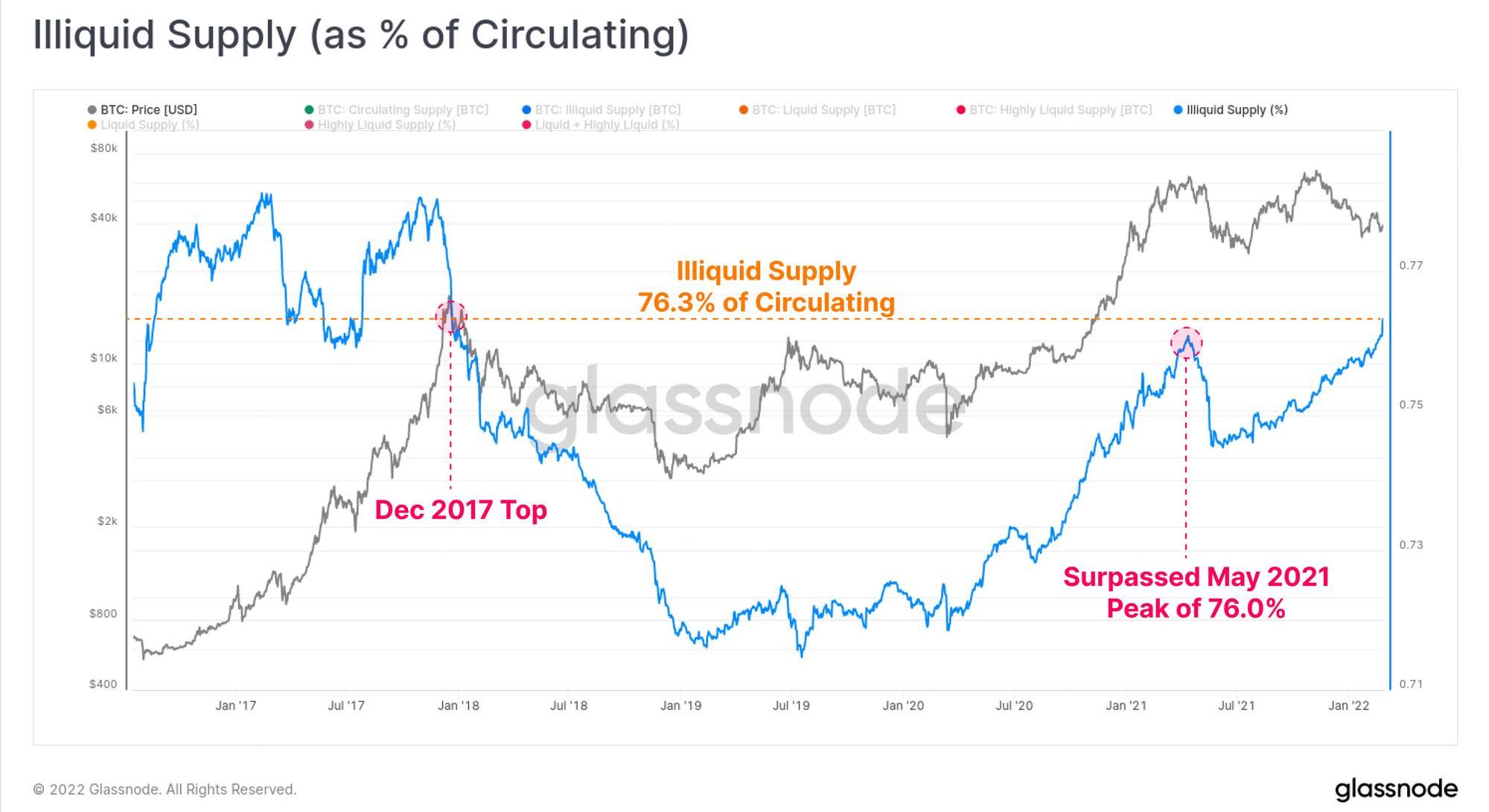 非流动性供给占流通供给的比例已超过2021年5月的峰值,达到76.3%。这现在已经回到了与2017年市场顶部相同的水平,扭转了长达四年的代币钱包流动性的增长。然而,请注意,这两种情况都发生在重大抛售事件之前,因此这些这些代币是否真的处于冷藏状态,还有待观察。
