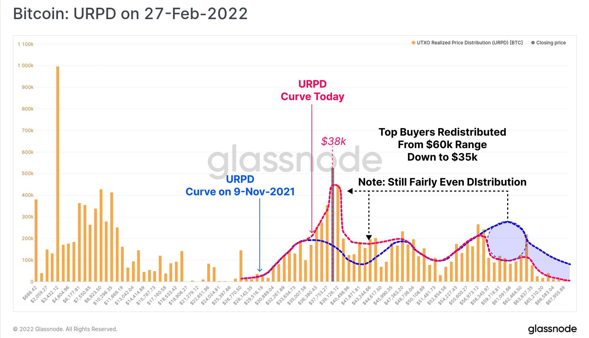 此外,主要的再分配似乎来自于那些在历史高点附近买入6万美元以上范围的投资者,他们已经在当前的3.5万美元至3.8万美元的价格区间找到了新的所有者。