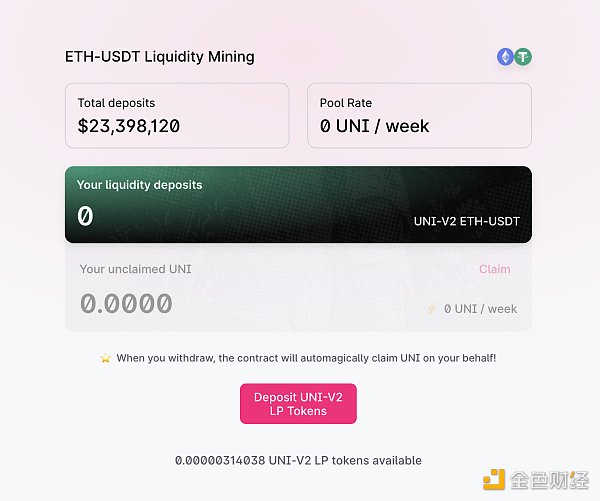 12.我们的目标是提供流动性后,进行流动性挖矿,也就是需要用流动性的证明去挖UNI,此时因为已经提供完流动性,当我们点击最上方的UNI按钮,在挖矿页面的ETH-USDT选项中,可以发现在Deposit UNI-v2 LP的按钮下面,出现了提供流动性代币的具体数量。点击deposit按钮,就可以正式开始UNI的流动性挖矿了。