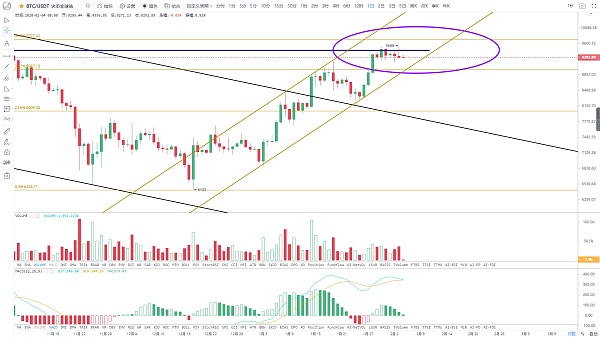 日线上,整体依然处于前期触底6433美元拐头上行的通道区间内,技术上只要不破,短线依然持币为主,均线也较为明显向上,成交量较为一般,仍需一段时间的震荡消磨仍是大概率,日线MACD快慢线有死叉趋势,短线有调整的需求,切忌追高,调整即是低吸的机会,操作上还是逢低布局为主,支撑8900美元,压力9600美元。