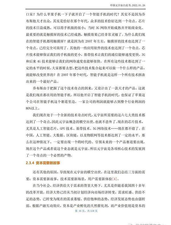 近日,2022《中国元宇宙白皮书》在北京中关村正式全网发布。该白皮书由国科创新研究院首席科学家,中关村数字媒体产业联盟常务副秘书长,中关村数字媒体产业联盟元宇宙实验室执行主任龚才春主编。由北京信息产业协会、中关村数字媒体产业联盟、中国科技新闻学会大数据与科技传播专业委员会等组织起草。该白皮书分为缘起篇、现状篇、技术篇、产业篇、法律与监管篇、伦理与风险篇、经济篇、人才篇、畅想篇这九个篇章,从元宇宙的缘起、发展现状、技术支持、相关产业等方面进行了全面、深入、细致的分析、总结和畅想。白皮书全本PDF电子版538页。