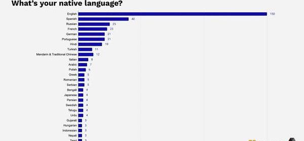其中35%的受访者的母语是英语,其次是西班牙语、法语、俄语、葡萄牙语和德语。