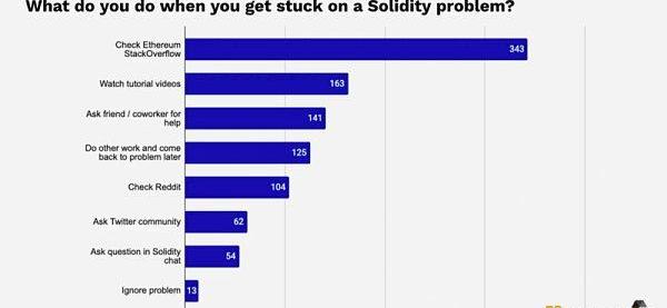 当陷入Solidity问题时,80%的人会尝试在以太坊StackExchange或StackOverflow上寻找解决方案,许多人还向他们的同事寻求帮助或观看教程,暂时搁置问题去做其他工作,稍后再尝试解决也很受欢迎。