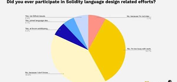 不到20%的受访者曾参与过与Solidity语言设计相关的工作,6.2%参加了Solidity论坛的讨论,5.1%参加了语言设计电话会议,6.4%在Solidity存储库中打开或贡献了Github问题。
