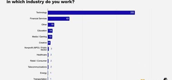 受访者主要在科技和金融服务领域工作,除此以外教育、媒体以及游戏等领域的占比也相对较高。