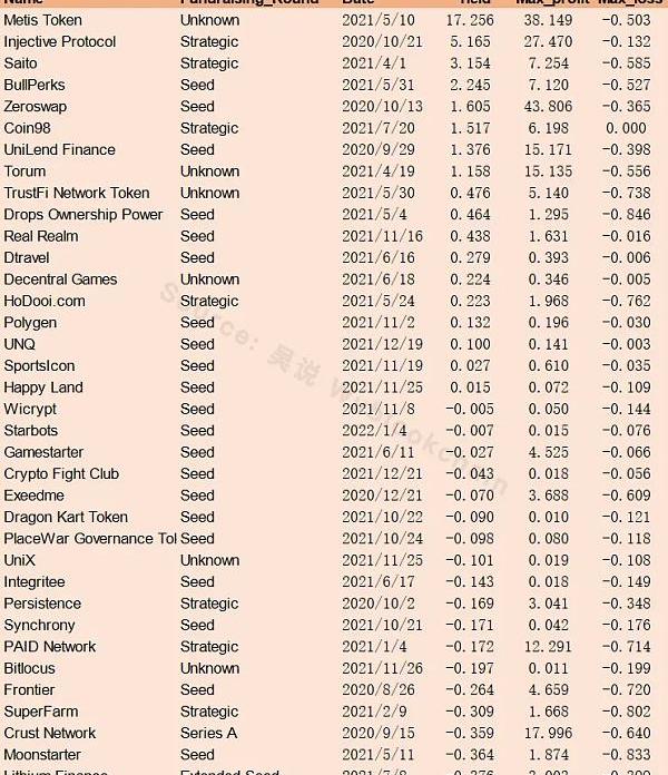 非常重要的一点是,项目token的损益不是从发行日开始算起,而是从融资信息公布日开始算。以AxieInfinity为例,该项目发行至今上涨了超过300倍,a16z与Paradigm等一众知名VC都参与了其B轮融资,但如果按发行以来的收益率计算就会高估他们的实际收益率。事实上,B轮融资是去年10月公布的,而Axie的暴涨发生在去年夏天,如果只计算10月以来收益率,那么真实数字为-50%。