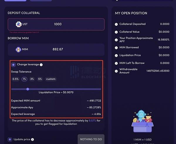 将UST作为抵押品存入后,点击「ChangeLeverage」,就可以根据自己的需求调整借出的杠杆。之后协议就会自动将借出的资产存入Anchor赚取APY。可以看到,通过提升杠杆,用户所获得的APY能够远超原有的20%。