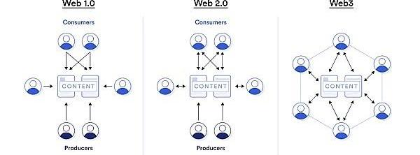 Web1.0、Web2.0和Web3中内容消费者与创作者之间的互动关系。