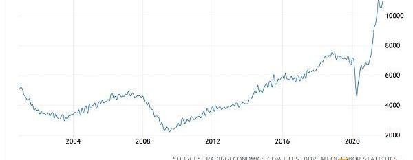 截至2021年10月份美国非农就业在招岗位数量