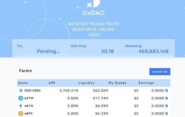 0xDAO祭出「战旗」,专门打击那些从Fantom长期建设者那里吸引短期流动性的组织,喊出「保障用户资金安全」的口号,但战法和VeDAO类似——用户通过锁仓单一Token或提供流动性,获取0xDAO治理通证OXD奖励,目前支持用户锁仓的单一资产为FTM、ETH、USDC、DAI等资产,LP池包括OXD-USDC。