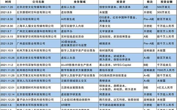 事实上,自2021年7月扎克伯格大炒元宇宙概念以来,科技企业或多或少都开始了元宇宙的布局。在国内,据商业数据派不完全统计,自2021年7月以来,一级市场虚拟人相关的核心投融资事件已达到18次。