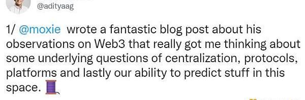 Moxie了一篇关于他对Web3的观察的精彩博文,让我思考了一些关于中心化、协议、平台以及最后我们在这个空间预测东西的能力的基本问题。