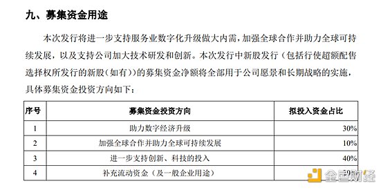 募资用途包括助力数字经济升级(占比30%)、加强全球合作并助力全球可持续发展(占比10%)、进一步支持创新、科技的投入(占比40%)、补充流动资金(占比20%)。