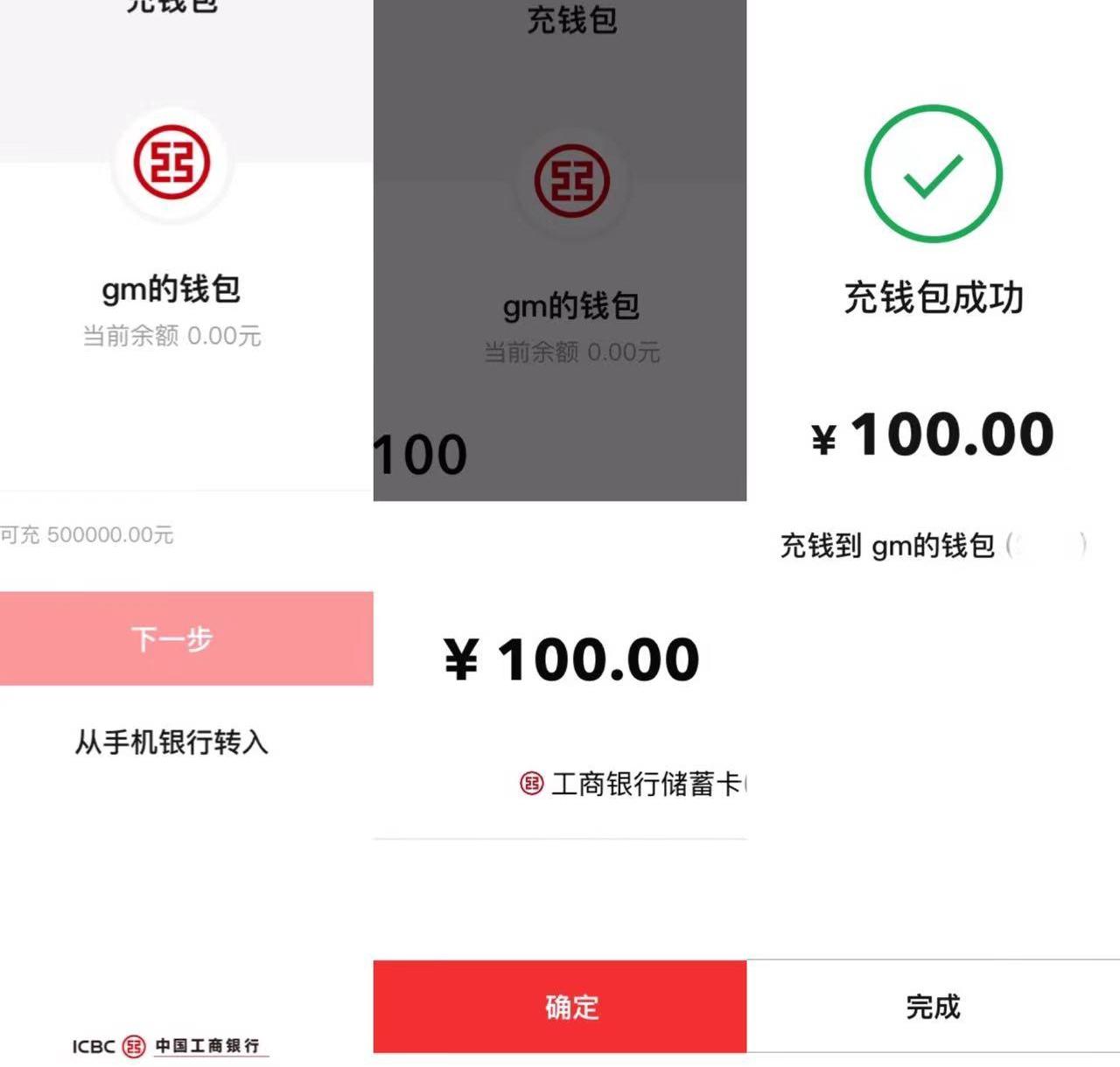 然后,律动BlockBeats试测向该钱包中转入了100元人民币,可分为两种方式转入,一种是通过储蓄卡直接转入,另一种则是打开手机银行的App转入。