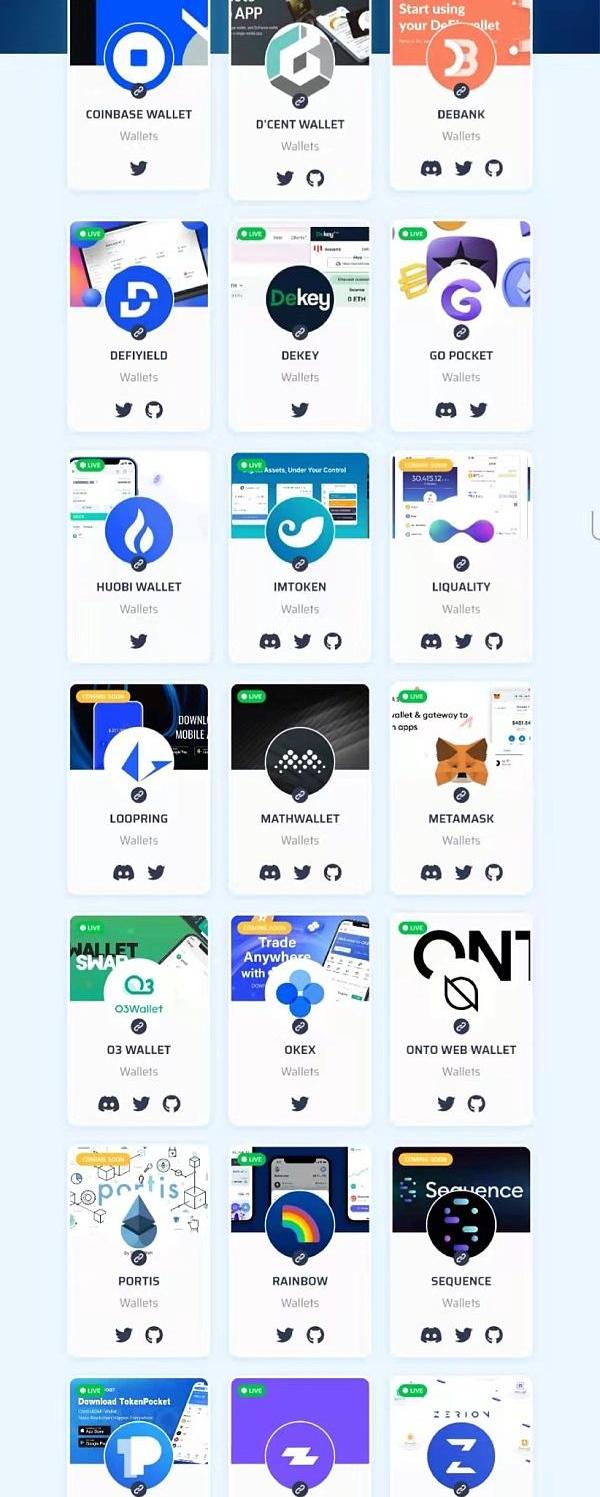 钱包列表如下,包含传统钱包、DeFi钱包、智能合约钱包以及其他基础设施。
