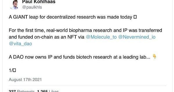如果NFT成为IP会怎样?想象一下,在一个没有许可的研究世界里,在线集体聚在一起解决一个特定的问题。针对特定医学主题的reddit论坛是无害的。如果你让这些集体有能力拥有并资助这项研究,我们就可以拆分生物技术和医药分销。