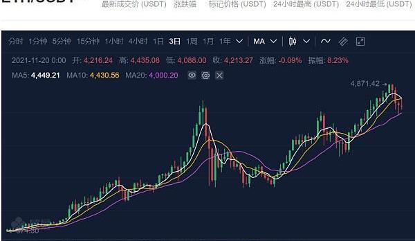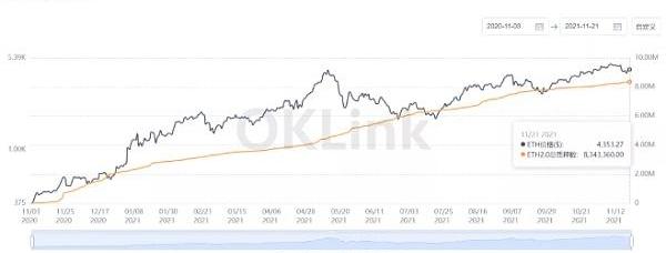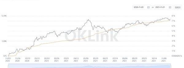 接下来我们再对比一下这一年间ETH价格的变化。在2020年12月1日,据欧易OKEx平台报价显示,当日ETH收盘价为618.88美元,而之后一年内,ETH价格最高达到4871.42美元,涨幅超过了687.1%。