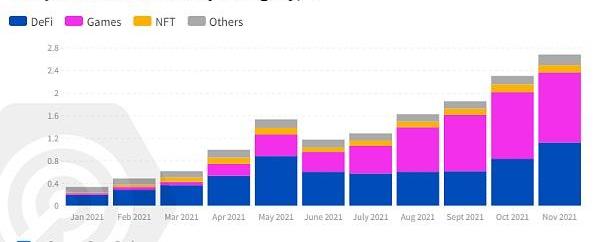 2021年11月,Dapp行业继续在不同的垂直领域扩张。在元宇宙叙事、边玩边赚Dapp、以及虚拟土地价值上升的推动下,Dapp行业保持向上势头。但是,在连续三个月交易额超过40亿美元后,NFT市场开始遇冷。与此同时,随着Avalanche、Arbitrum、Elrond和Ronin等新晋公链及Layer2锁仓资产价值上涨,DeFi的采用继续得到稳固。