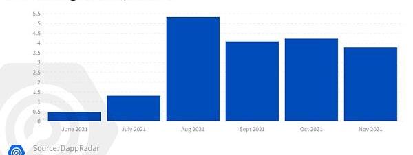此外,在2021年11月,平均每天有250万个独特的活跃钱包(UAW)连接到区块链Dapp,其中链游用例占到一半以上,这一领域的市场竞争也持续升温。在NFT方面,收藏品系列在经历了三个月的交易量暴涨之后开始经历一段冷却期,相比之下,区块链游戏中的NFT及边玩边赚的发展更快一些。
