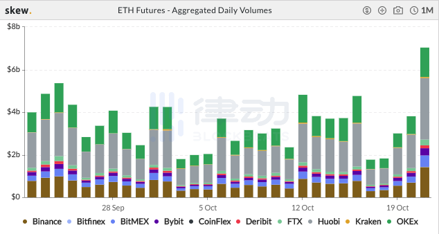 总交易量约为 70 亿美元,其中,火币 29 亿美元,币安、OKEx 14 亿美元;