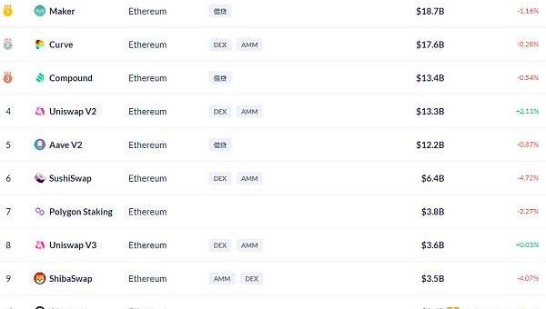 Ethereum链上DeFi锁定资产前十排名及锁仓量,数据来源:Debank