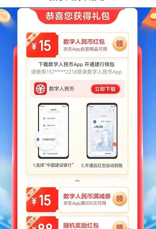 具体操作上,参加活动的用户,需在京东App报名成功且通过资格审核,可获得三重奖励礼包,最高可得118元。第一步操作是:在数字人民币App中开立建设银行钱包,就可百分百获得15元数字人民币红包。第二步操作是将建设银行子钱包推送至京东App后,又可获得一张满200减15元的数字人民币满减券。第三步则是通过活动页面的分享功能,分享活动信息给亲朋好友后,还可获得最高88元的随机金额数字人民币红包。