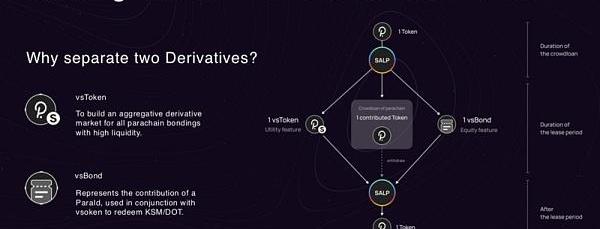 先说Bifrost做的SALP,该方案全称为「插槽拍卖流动性协议」。SALP与其他方案最大的不同点在于,当用户通过SALP协议质押了自己的DOT后,可以获得vsDOT和vsBond两种衍生品。其中vsDOT?是完全的同质化代币,代表了用户质押给平行链众贷的凭证,可随时交易或在平行链租期结束后配合vsBond进行1:1赎回;vsBond则不完全同质,其属性代表了用户支持不同项目竞拍所获的众贷奖励,所以投给不同项目所获得的vsBond也是不同的,比如支持Acala和Moonbeam将生成不同的vsBond-Acala和vsBond-Moonbeam。