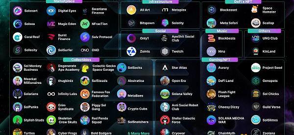 从生态来看,据Solana官方释放的数据看,Solana生态角色已经有500个,构筑了基建、钱包、工具、浏览器、预言机、DeFi、Dapp、NFT、GameNFT、基金等不同生态矩阵,NFT生态最为壮观,已经有193个,其次数量最多的是DeFi生态,已经有116个,其次是Dapp,有93个,再就是钱包、基建、工具等,生态门类多样且丰富。这也侧面显示出Solana已经从单纯的技术公链,成长为支撑各类主流加密产业发展的一块沃土。