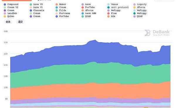 Ethereum链上DeFi锁定资产前十排名及锁仓量,数据来源:Debank
