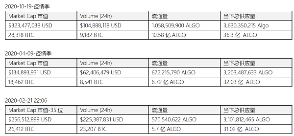 Algorand二级市场受新冠肺炎全球投资整体影响,3月波动性较大,最低降至0.09美金但随后整体回归正常并于9月份达到0.8美金左右,相较于3月份提升了7倍左右的价格,并于近日回调至0.3美金附近。