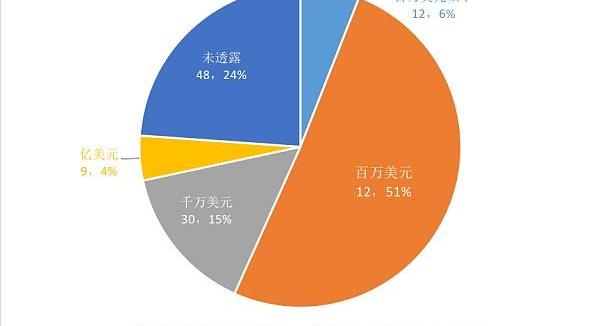 在已透露融资额的项目中,51%的获投项目融资额在100—1000万美元区间,千万美元和数亿美元级别的融资事件分别发生30起和9起,占比15%和4%。