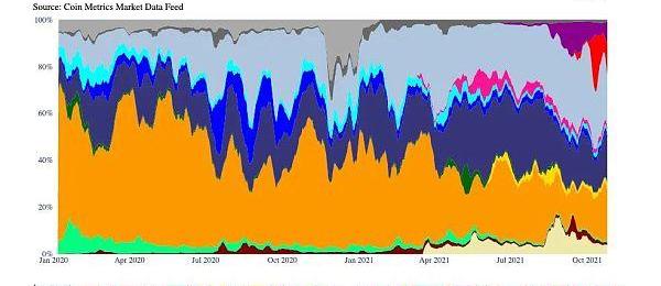 有几个潜在的因素在起作用。首先,一些零售交易量可能已经从BTC转移到其他加密货币资产。在一些最大的加密货币资产中,目前BTC的现货交易量的相对份额低于今年早些时候的交易量。下图按基础资产细分了Coinbase的每日现货交易量,并显示较新上市的资产,如Solana、Cardano和ShibaInu已经占据了每日交易量的重要份额。随着DeFi和NFT的采用增加,ETH在总交易量中的份额也在增长。然而,BTC的份额在过去几周里一直在增加,也许这表明散户正在返回BTC市场。