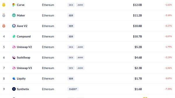 Ethereum链上DeFi锁定资产前十排名及锁仓量,数据来源:Debank