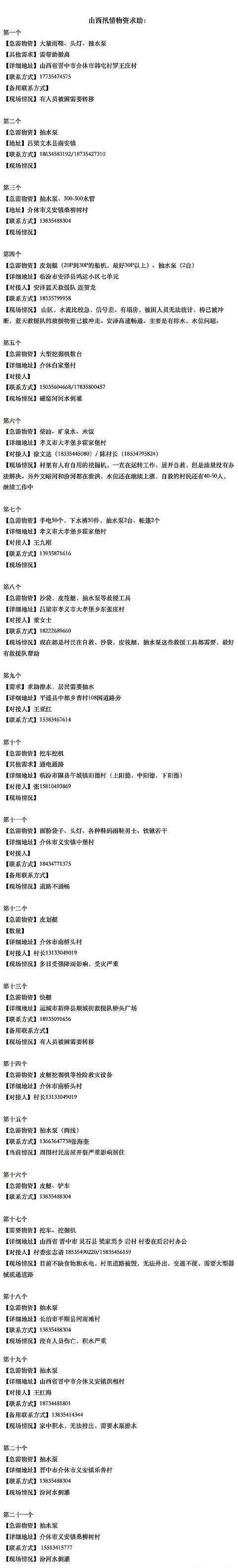 山西暴雨牵挂着全国人民的心,根据山西防灾服务台志愿者核实,急需救援物资汇总如下: