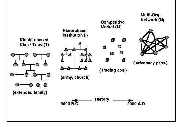时代报告创造了一个社会进化的叙述,其中人类通过四种不同的组织形式取得进步: