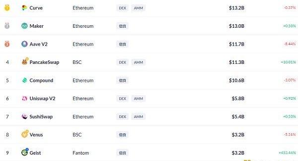 DeFi项目锁定资产前十排名及锁仓量,数据来源:Debank