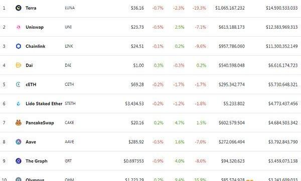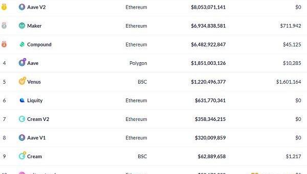 DeFi项目锁定资产前十排名及锁仓量,数据来源:Debank