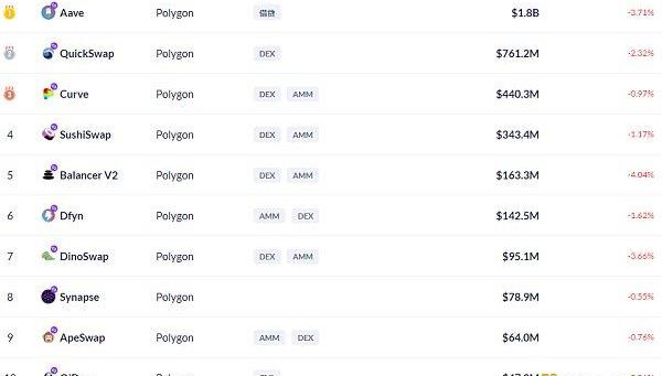 Polygon链上DeFi锁定资产前十排名及锁仓量,数据来源:Debank