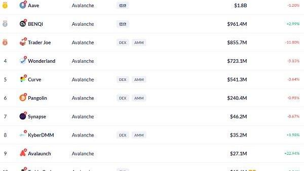 Avalanche链上DeFi锁定资产前十排名及锁仓量,数据来源:Debank