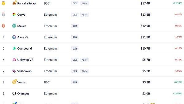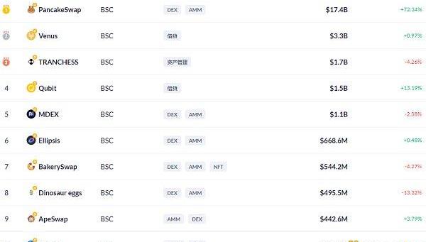 BSC链上DeFi锁定资产前十排名及锁仓量,数据来源:Debank