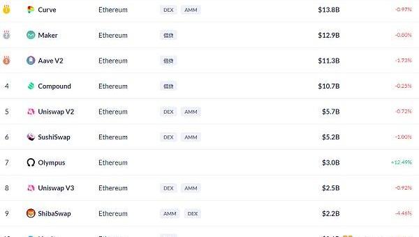 Ethereum链上DeFi锁定资产前十排名及锁仓量,数据来源:Debank
