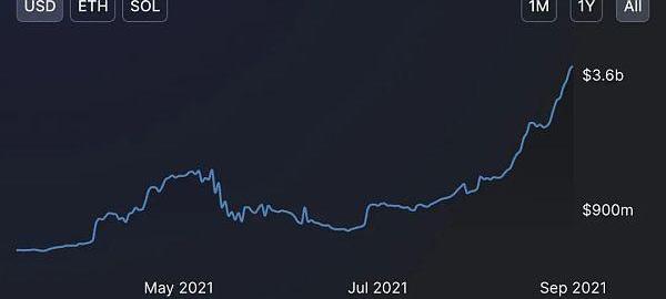 Solana是另一个公链生态系统,在过去几个月经历了强劲的增长。在SOL价格上涨、网络上推出新协议、小型NFT狂热以及Phantom钱包采用的诸多刺激下,Solana自7月以来,其TVL上涨了近6倍,达到36亿美元。