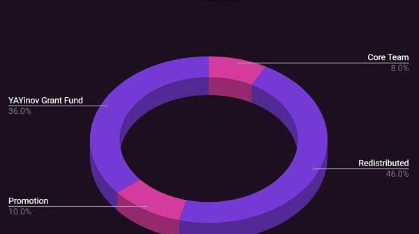YaySwap代币为YAY,总供应量为一亿枚代币,其中56%的代币会在代币发布后分给早期使用者,8%的代币归团队,剩余的36%归YAYinovGrantFund。这个基金将用来激励和资助Cardano链上的新项目。